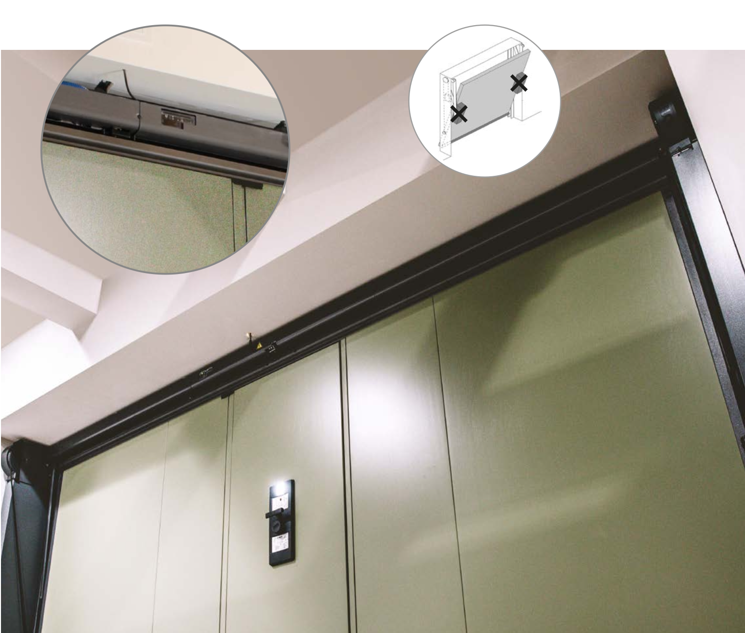 - Motorizzazione nascosta nella traversa superiore del telaio perimetrale della porta